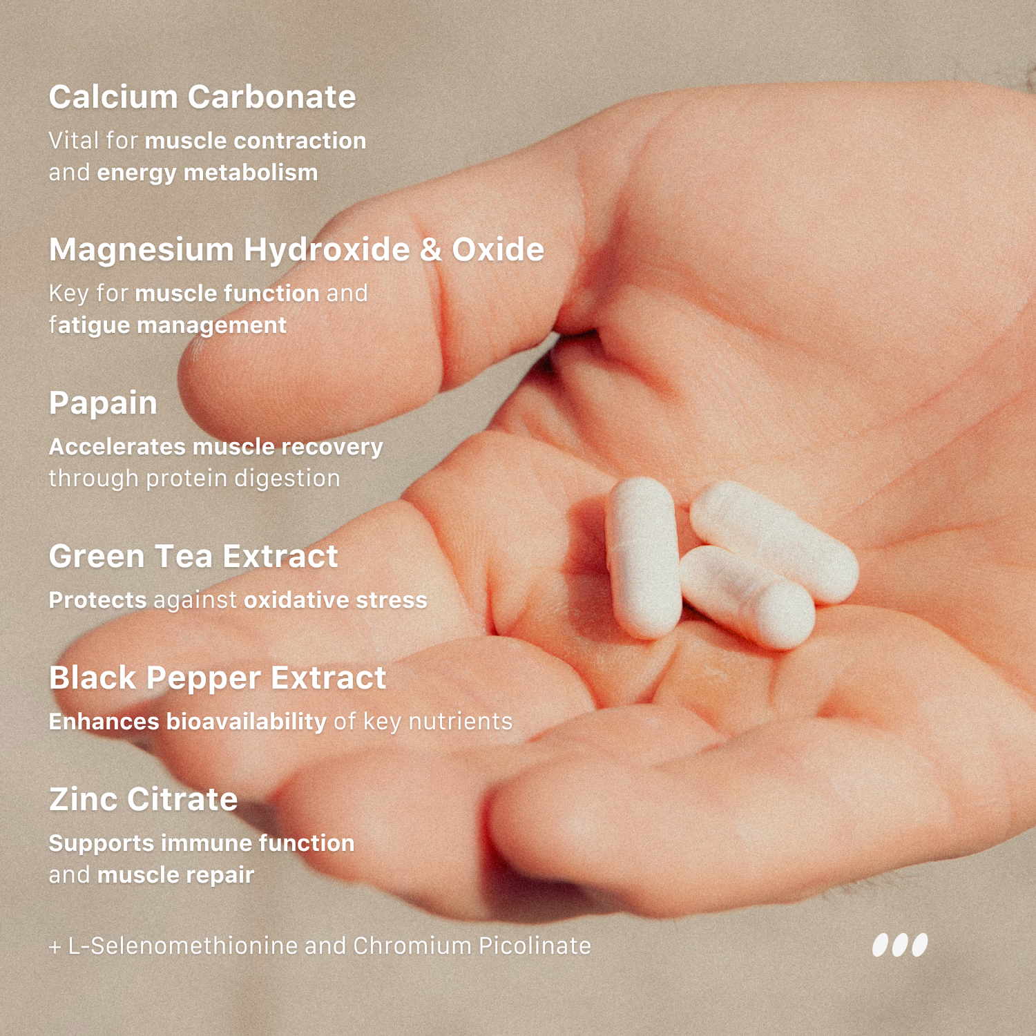The formula combines calcium and magnesium to buffer lactic acid and stabilise electrolyte balance, helping muscles keep firing under pressure. Papain supports protein breakdown for faster nutrient delivery, while green tea extract and piperine enhance absorption and aid cellular recovery.