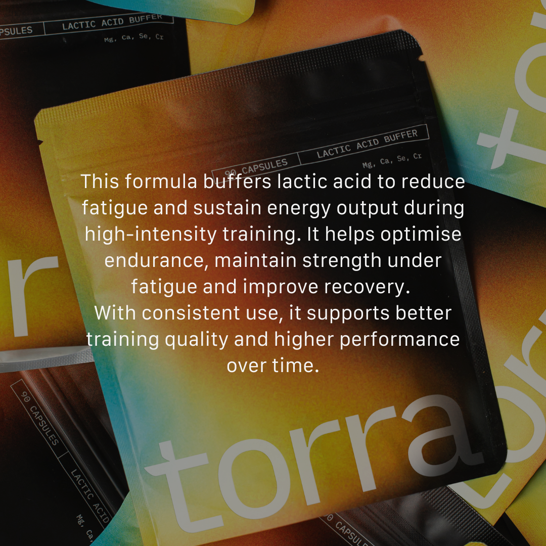 High intensity and endurance training rapidly increase muscle acidity, which disrupts energy production and accelerates fatigue. Torra's lactic acid buffer capsules are designed to target this physiological bottleneck.