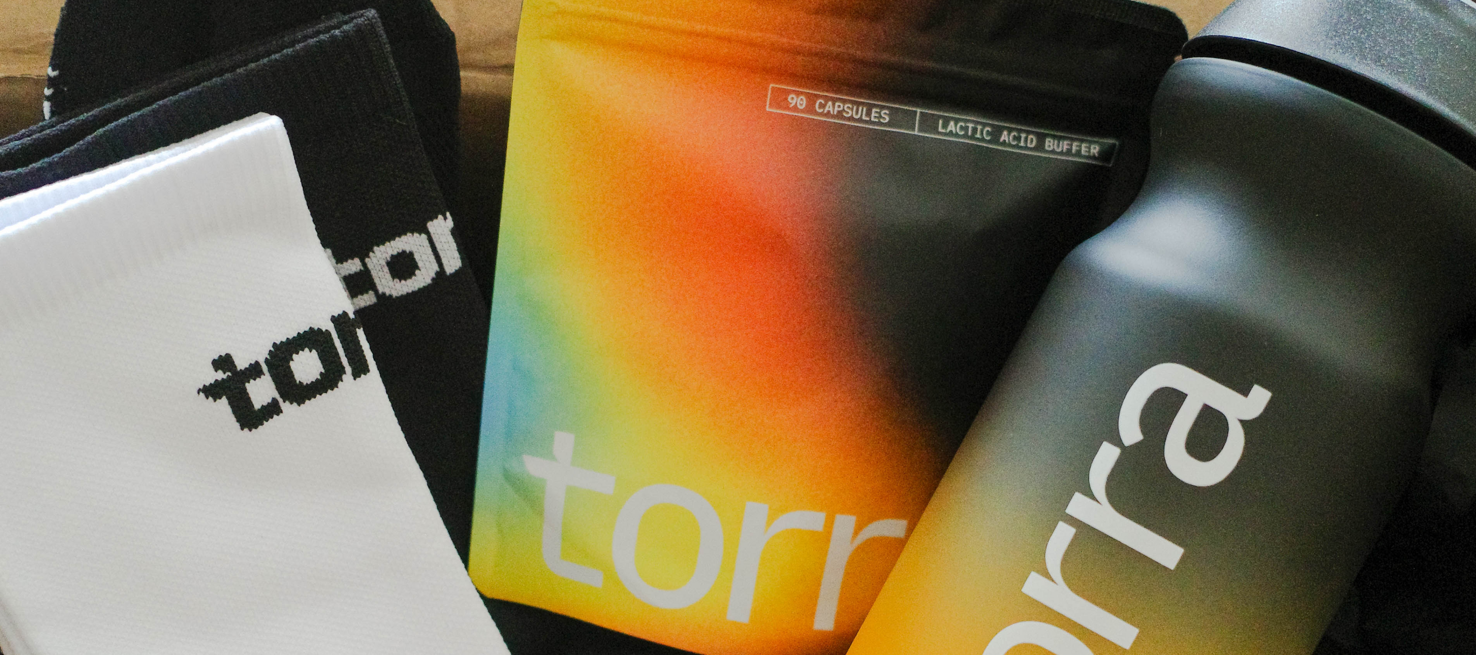A 1-month supply of Torra Lactic Acid Buffer Capsules (90 capsules), 2 pairs of Performance Socks (1 black, 1 white), and 1 Performance Water Bottle.